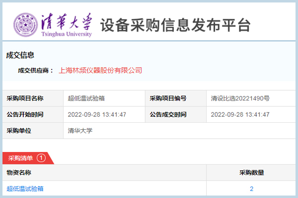 日前,清華大學(xué)設(shè)備采購(gòu)信息平臺(tái)發(fā)布中標(biāo)公示,林頻儀器一舉中標(biāo)超低溫深冷試驗(yàn)箱項(xiàng)目。此次投標(biāo)經(jīng)清華大學(xué)初步篩選后共有六家公司進(jìn)入了復(fù)選。